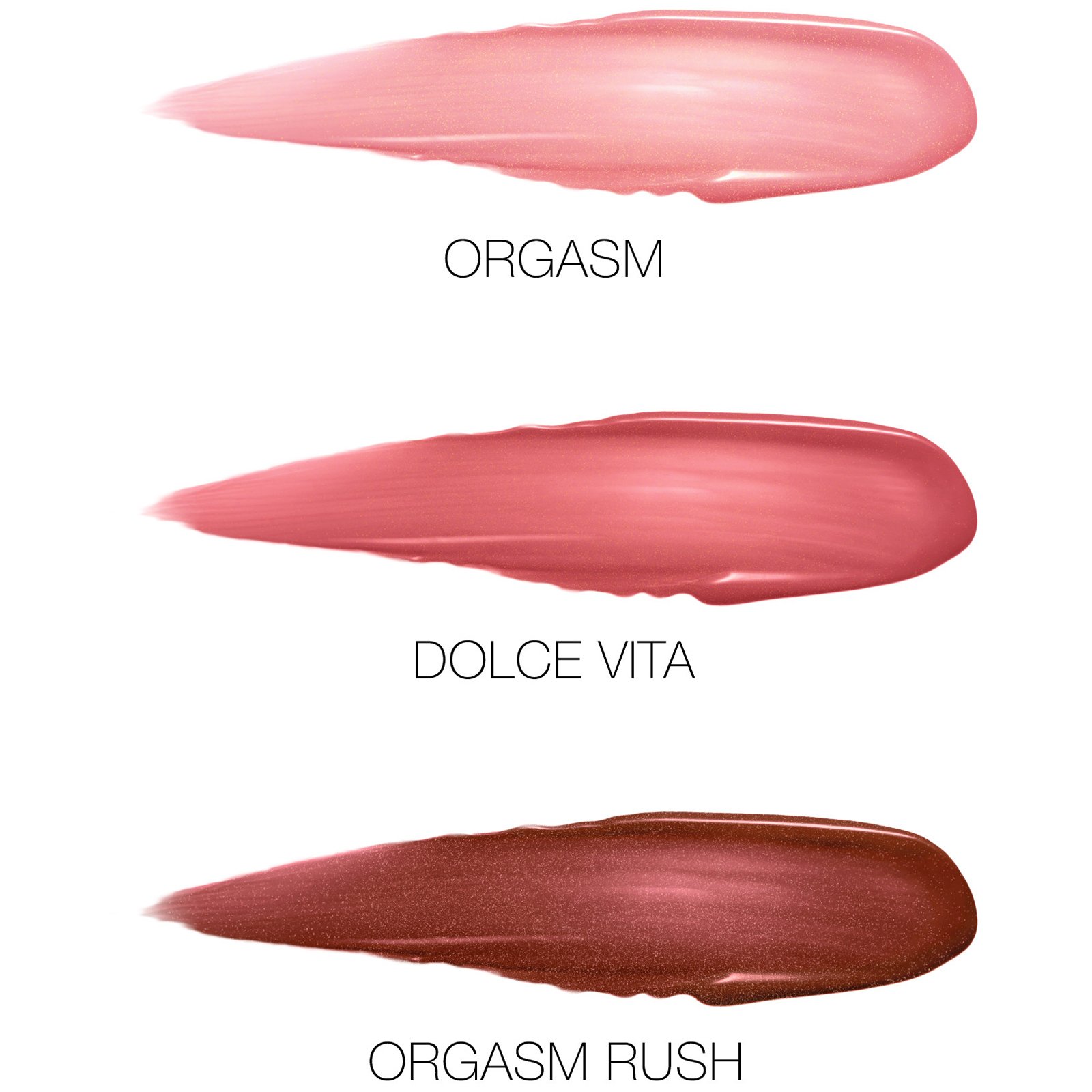 Orgasm: Water/Aqua/Eau, Dimethicone, Peg-10 Dimethicone, Triethylhexanoin, Butylene Glycol, Isododecane, Phenyl Trimethicone, Disteardimonium Hectorite, Mica, Trimethylsiloxysilicate, Peg-30 Dipolyhydroxystearate, Propylene Carbonate, Lauryl Peg-9 Polydimethylsiloxyethyl Dimethicone, Tocopherol, Caprylyl Glycol, Tocopheryl Acetate, Triethoxycaprylylsilane, Polyhydroxystearic Acid, Triethoxysilylethyl Polydimethylsiloxyethyl Dimethicone, Isopropyl Titanium Triisostearate, Silica, Galactoarabinan, Glycerin, Glyceryl Polyacrylate, Sodium Hyaluronate, Cocoyl Hydrolyzed Collagen, Hydrogenated Lecithin, Phenoxyethanol, [+/-(May Contain/Peut Contenir): Iron Oxides (Ci 77491, Ci 77492, Ci 77499), Red 7 Lake (Ci 15850), Titanium Dioxide (Ci 77891)].